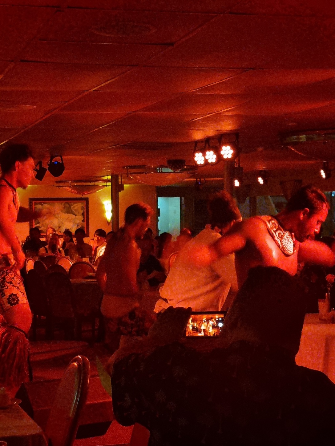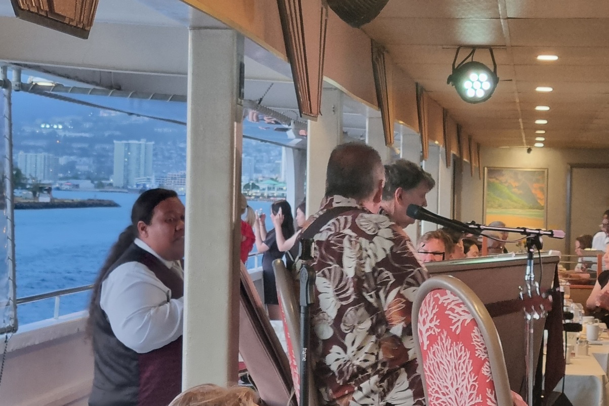 세계인이 하나가 되어 자리애서 일어나 춤판이 벌어집니다. 저희 테이블 서빙하시던 분도 춤판에 합류하셨네요.춤판은 YMCA 노래에 맞춰 절정에 다가갑니다. 배가 완전히 도착해서도 열기가 식지 않아요. 같이 탄 외국분들이 계속 노래도 따라 부르고 춤도 같이 추고 하다 보니 안 즐거울 수가 없는 스타오브호놀룰루였습니다.