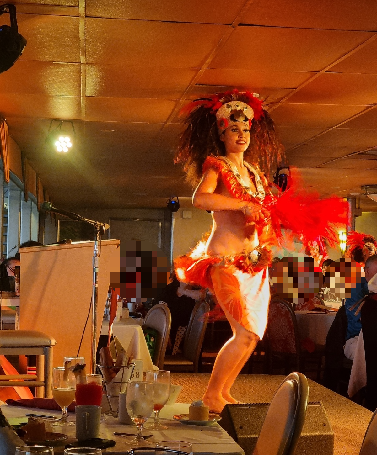 기둥뒤에서 서빙하던언니를 불러 세워 노래도 시킵니다. 가수처럼 잘 부르시네요. 나중에 하와이 전통공연할 때 보니까 이분들이 춤도 추시고 다재다능하신 분들입니다.