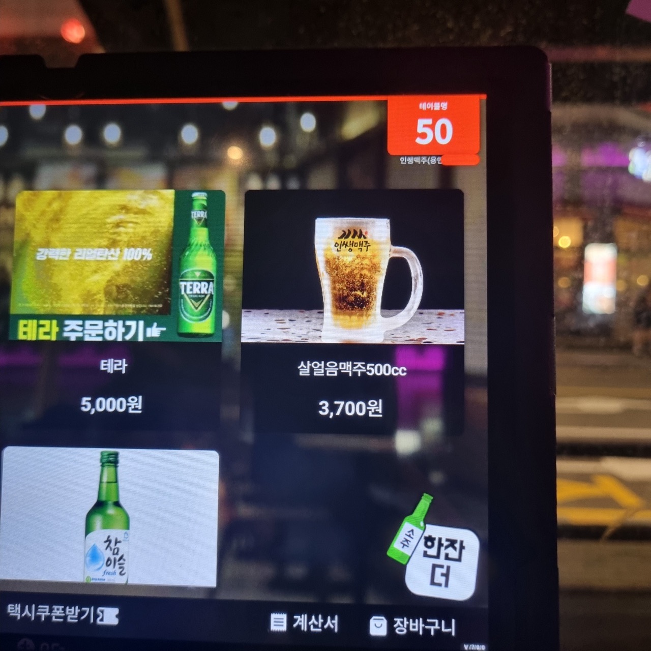 맥주는 얼음컵에 담아주는데요. 항상 테라를 마실까 이걸 마실까 고민하다가 선택하는 살얼음맥주입니다.