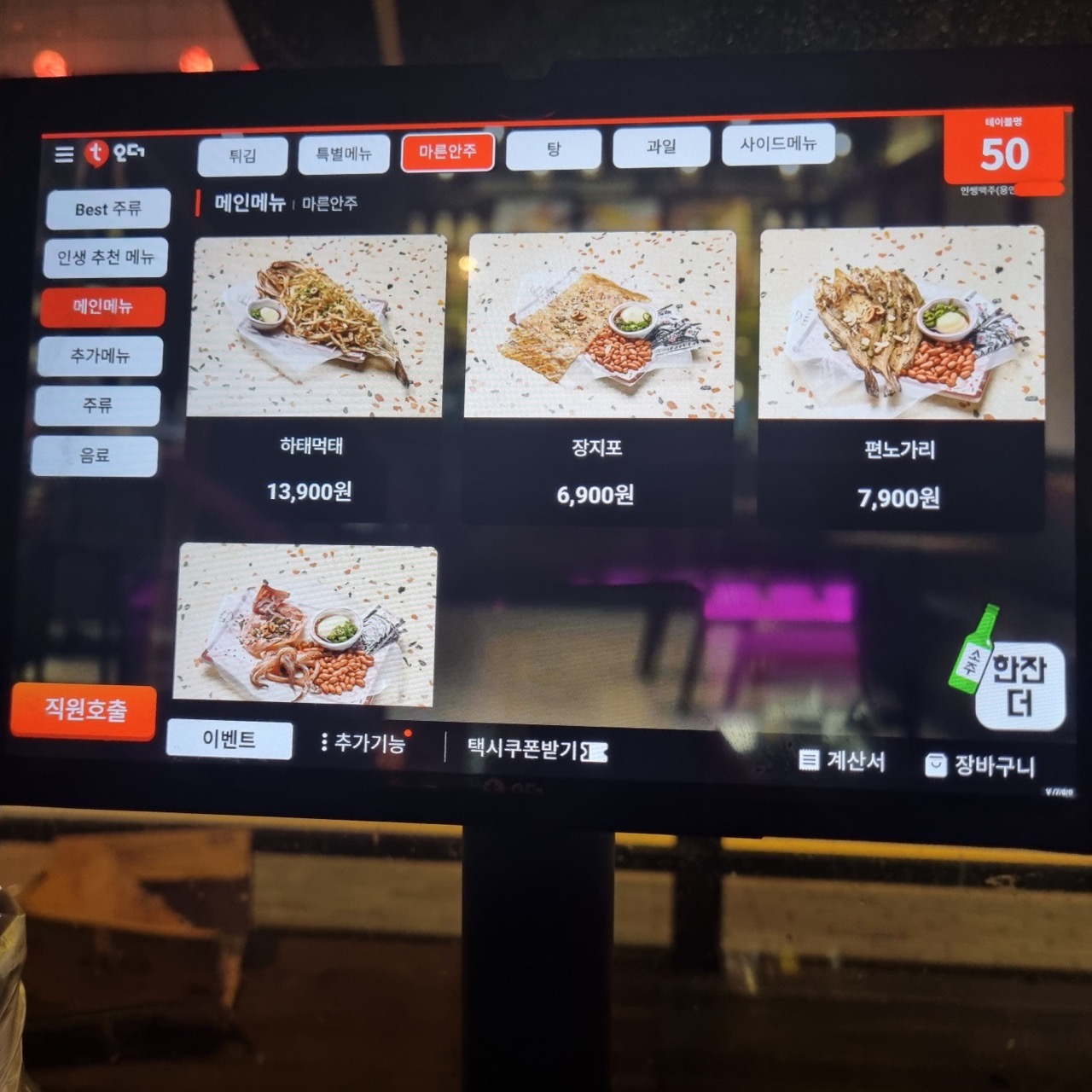메뉴는 t오더로 주문할 수 있고, 항상 선택하는 메뉴를 골라줍니다. 메인메뉴에서 마른안주 선택하고, 편노가리를 먹는데요. 생각보다 딱딱하지도 않고 통통하면서 부드러운 식감입니다. 나쁘지 않아요.