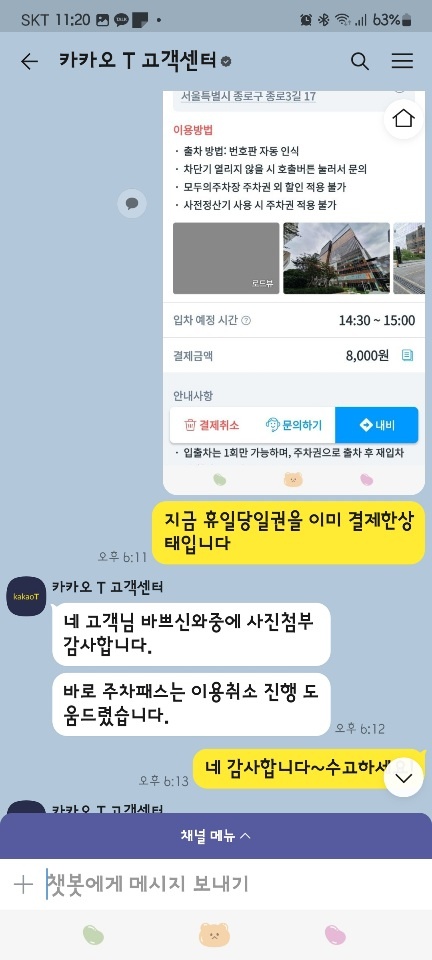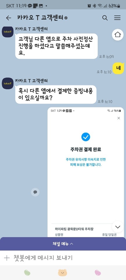 저는 이미 종일권을 구매했는데 중복으로 주차비가 나가면 너무 아까워서 고객센터와 톡을 해서 문제해결을 했습니다.