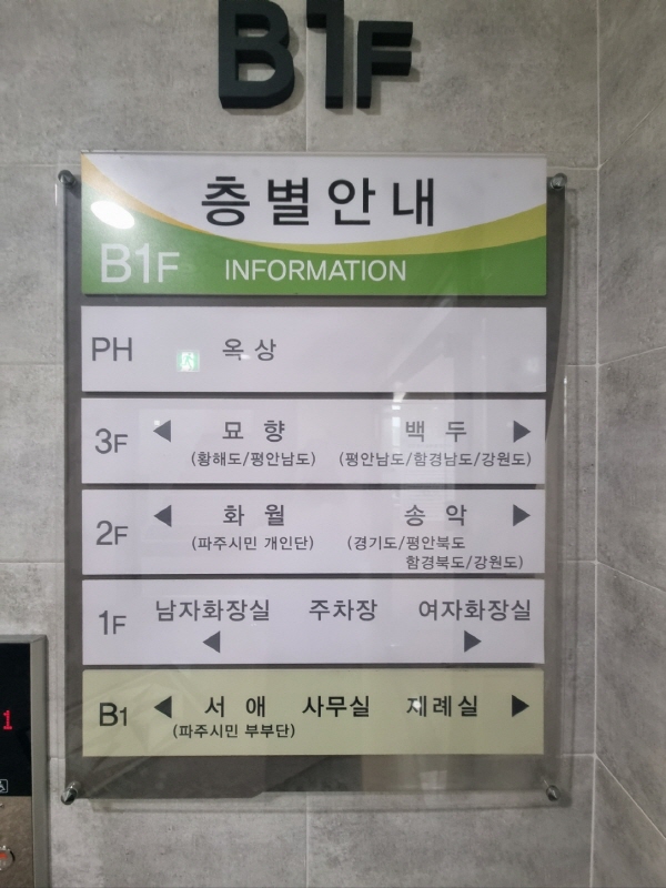 각 층과 호실마다 같은 지역 사람들끼리 모여 안치됩니다. 저희는 황해도민이셔서 3층 묘향실에 안치했어요.