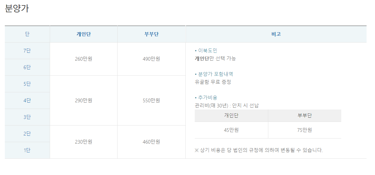 동화 경모 공원 추모관 분양정보