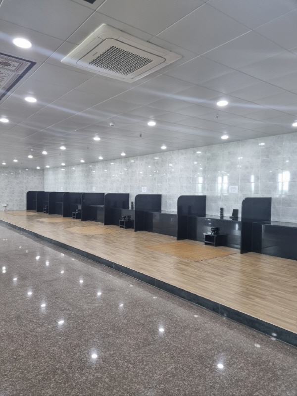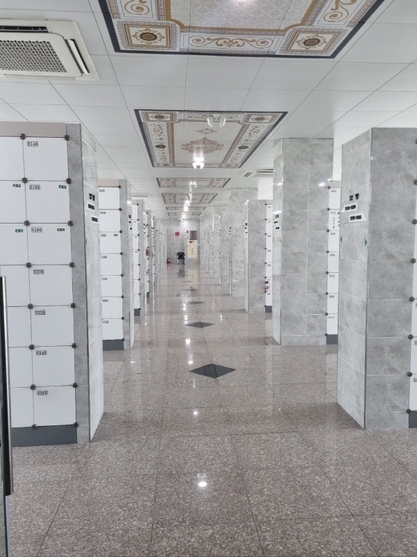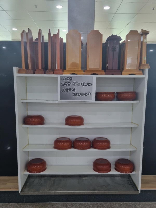 이곳은 지하 1층의 제례실이에요. 세어보니 제사를 지낼 수 있는 곳이 20석 있더라고요. 제사 지내는 곳 아래쪽으로 앉으실 수 있는 테이블과 의자도 마련되어 있어요. 저희는 집에서 다 준비해 갔는데 몇 가지 물품이 사용가능하네요.