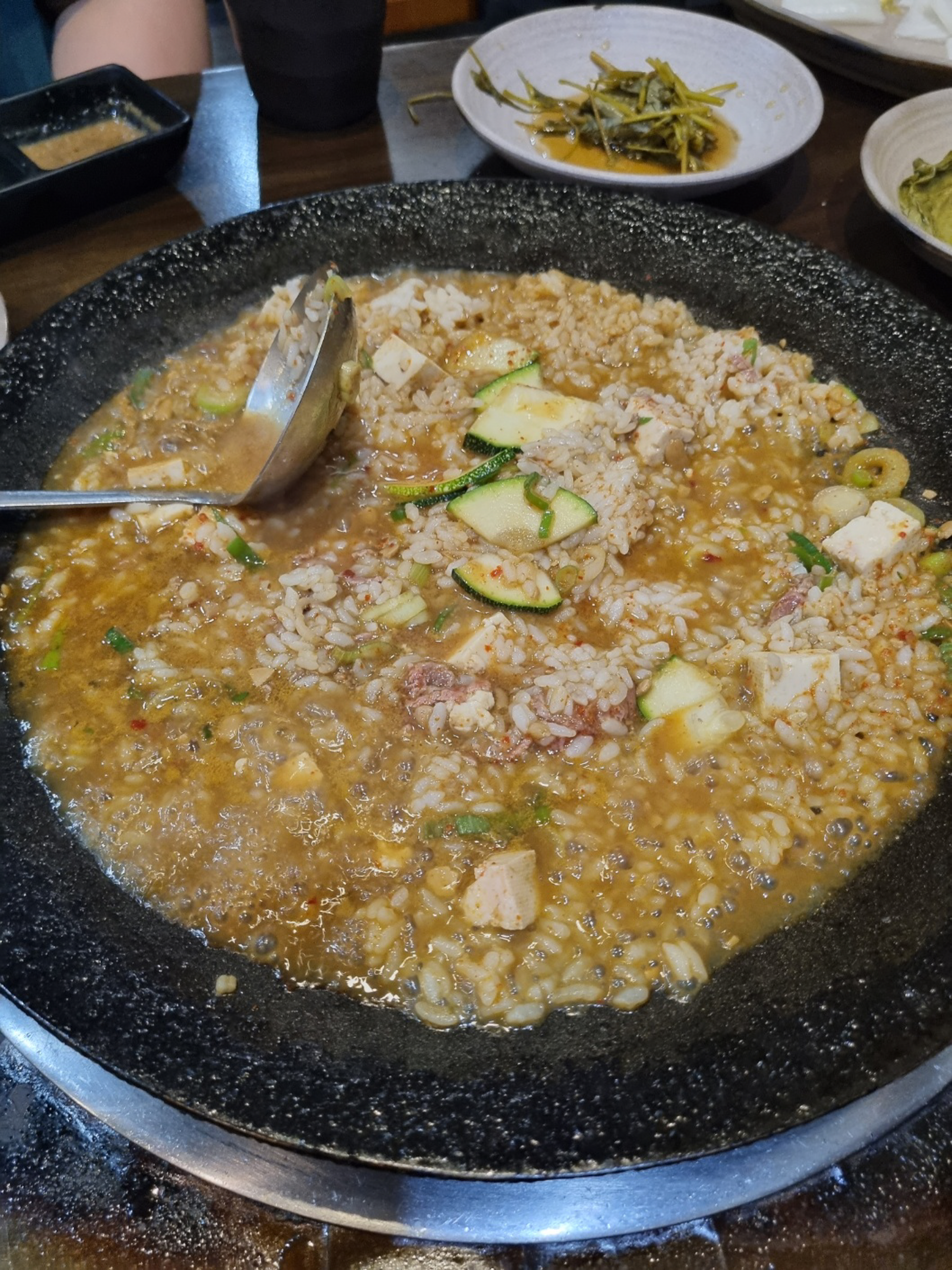 고기말이를 다 먹고 나니 코스요리처럼 불판에 된장 짜글이를 끓여주십니다