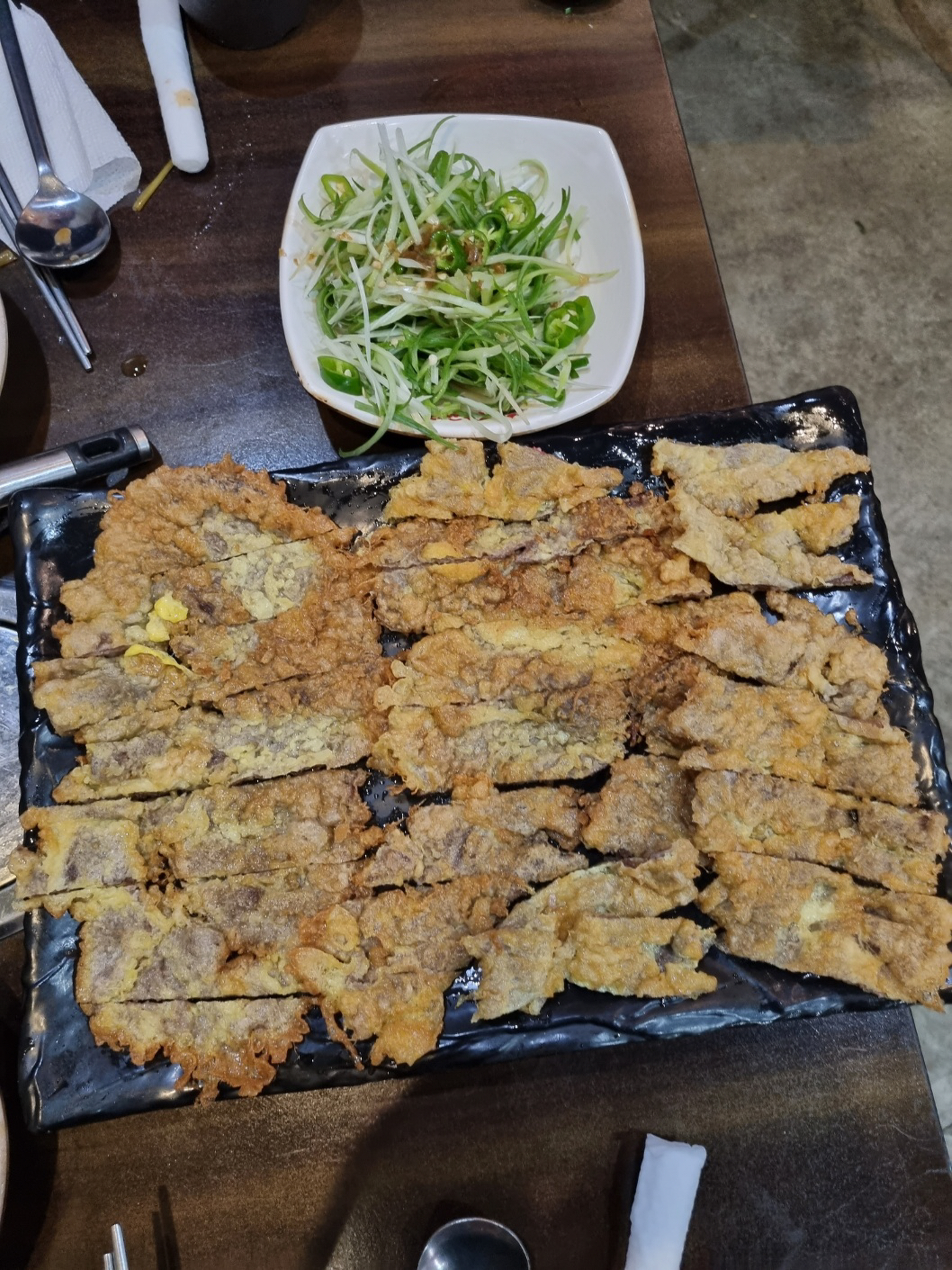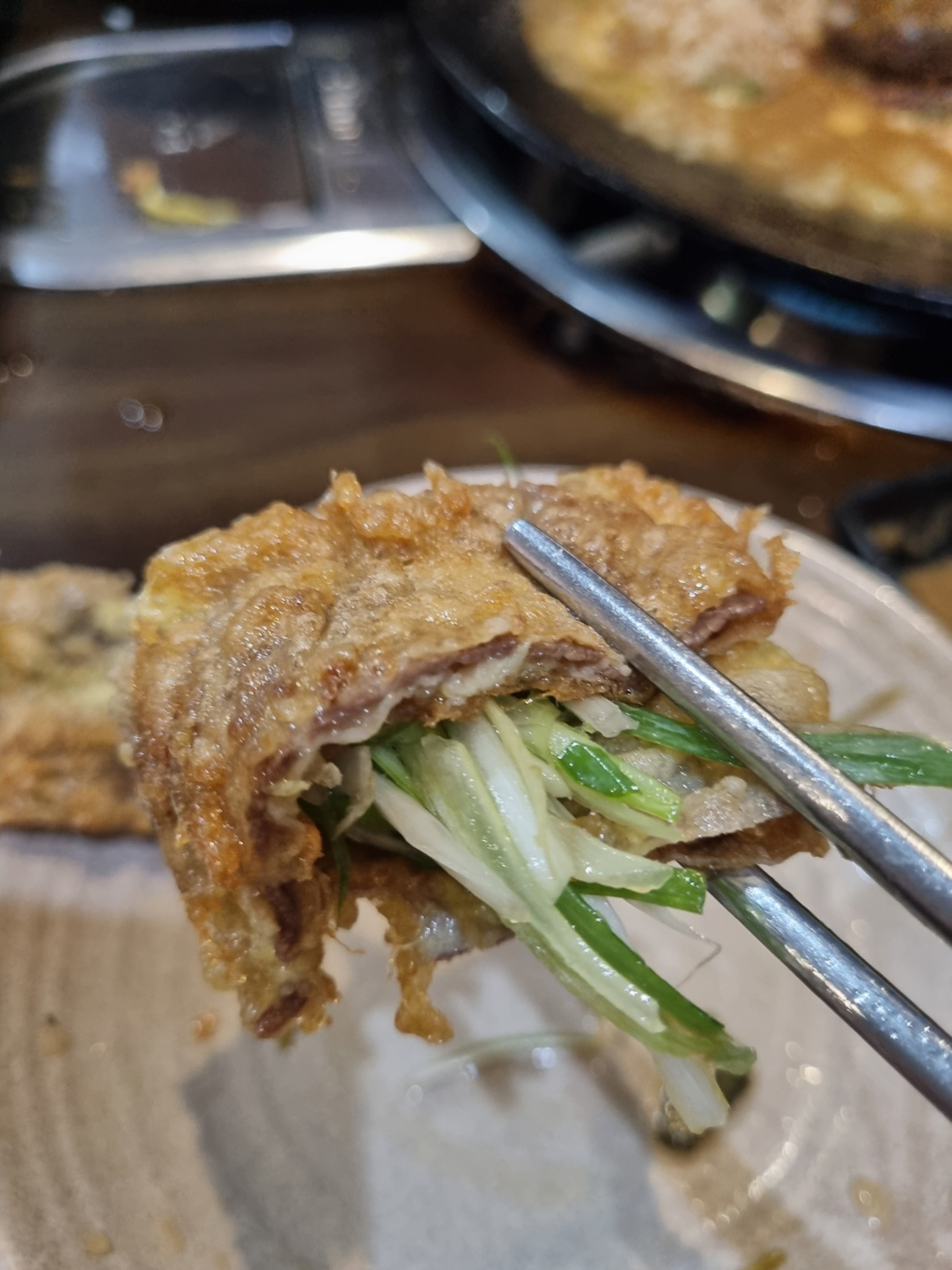 마지막으로 육전이 나왔어요. 육전은 주문하고 조리가 들어가기 때문에 시간이 걸린다고 해요. 파절임을 육전에 싸서 먹어봅니다.