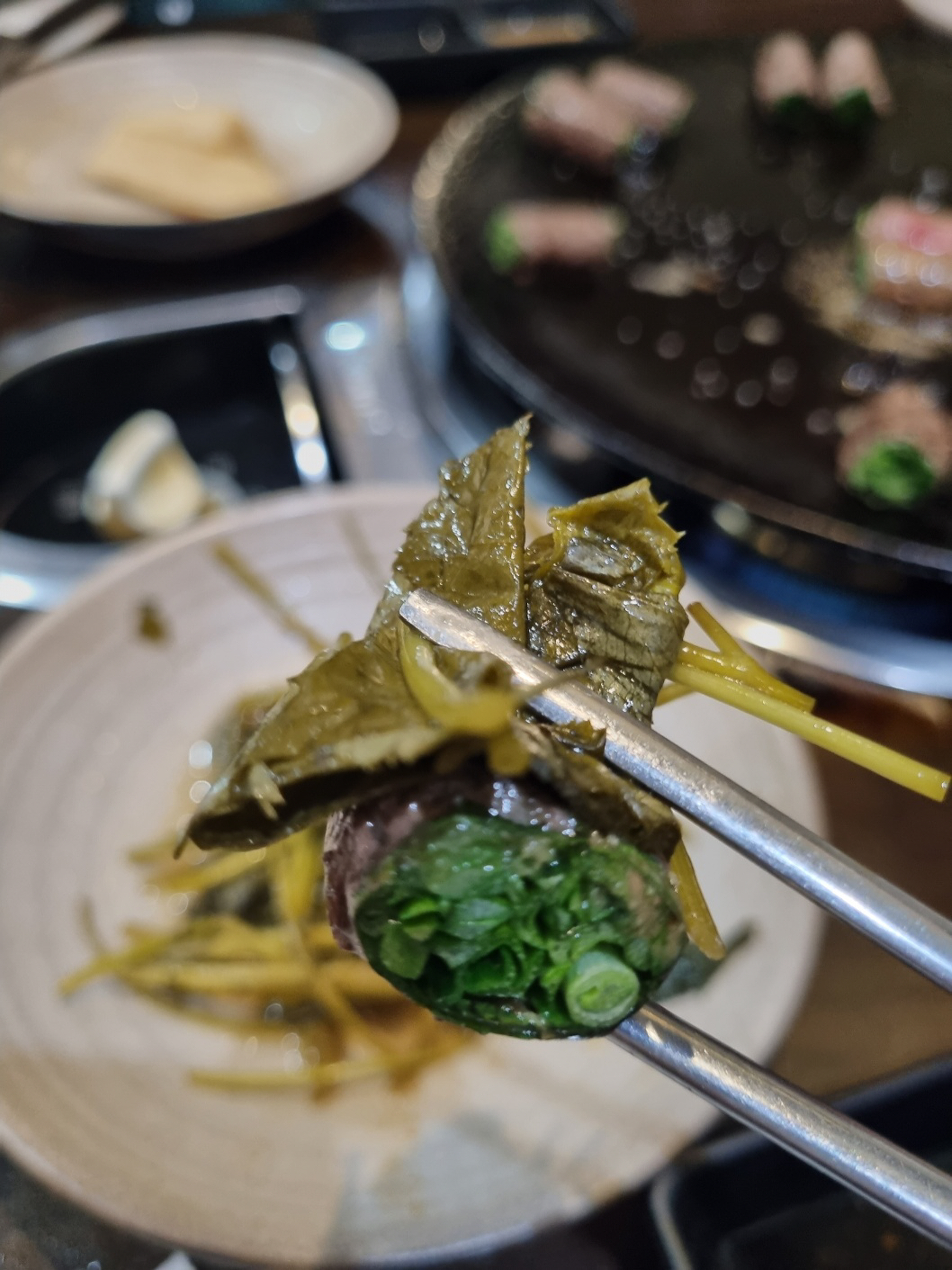 제일 먼저 고기말이가 나 왔어요. 땅콩소스에 찍은 고기말이를 깻잎장아찌에 싸서 먹어봅니다.