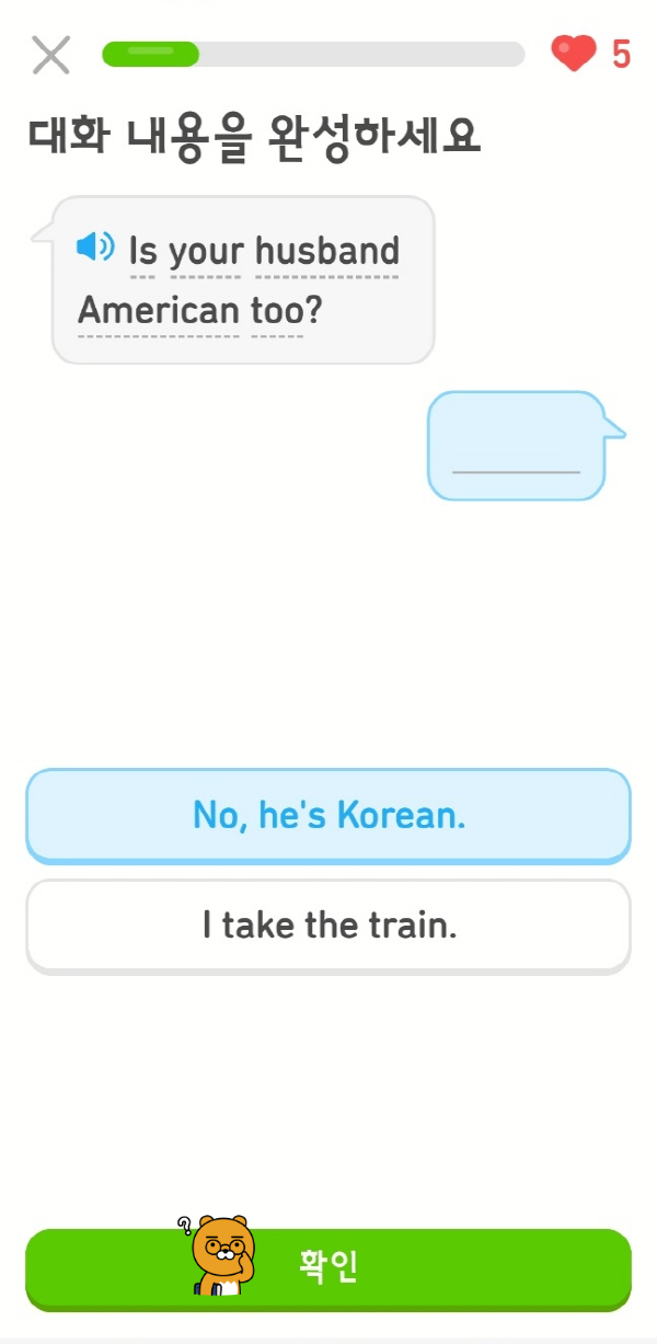 오답을 끝까지 바로잡아주고 반복시키는 게 듀오링고의 장점이지 싶습니다.