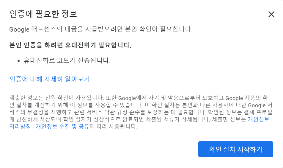 확인 절차 시작하기를 눌러서 인증을 시작합니다. 중간에 휴대전화로 코드를 넣는 부분이 있으니 휴대 전화도 준비해 주세요.