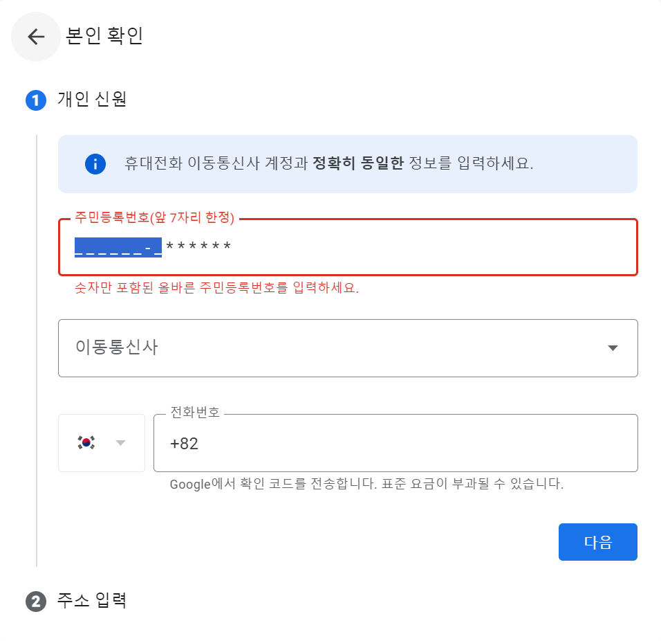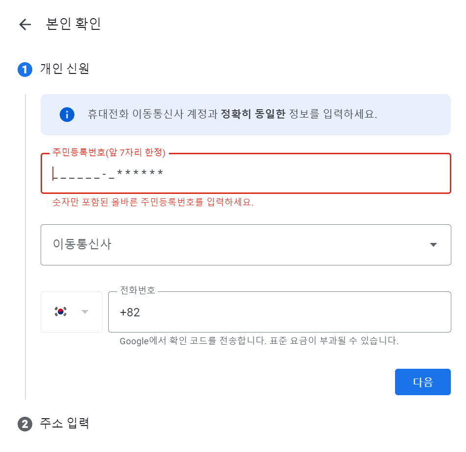 나머지 절차는 주소입력을 하신 후 구글에서 휴대전화로 코드가 오면 해당 코드를 입력하시면 끝이 납니다.