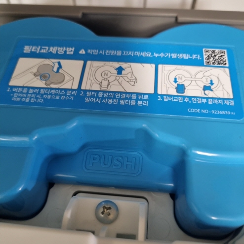 우선 상단에 커버를 밀면서 열어주면 간단한 설명서와 정수기 필터가 보이는데요. 보이는 push를 살짝 누르면 뚜껑이 열리고 정수기 필터를 뒤로 살짝 밀어주면 필터가 분리됩니다. 새로운 필터를 동일하게 넣어주고 뚜껑을 닫아주면 교체 완료입니다. 간단하죠?