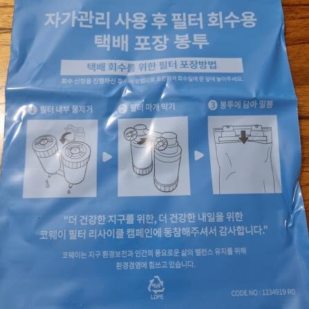 우선 택배 박스 구성입니다. 정수기 필터, 교체 시 필요한 소품, 교체 후 반납에 필요한 비닐 등이 들어있네요. 참고로 필터를 교체하고 나면 카카오톡으로 반납할 수 있는 안내가 옵니다. 재활용과 자연을 위해서 남은 필터는 반납해 주도록 해야겠습니다.