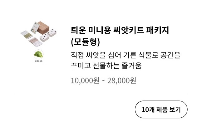 초보 식집사라면 식물생활에 있어서 패키지로 시작하는 게 나쁘지 않겠죠? 우선 키워보고 나랑 맞는지, 더 뭘 해줘야 하는지 공부하기에 좋아요. 아래에서 8종의 씨앗 키트 패키지를 구경해 보세요. 메리골드, 가자니아, 청치마 상추, 겨자채, 상추, 그리고 직접 재배한 청경채, 상추, 비타민 등 바로 수확해서 햄버거나 샐러드에 넣어 먹는 재미도 쏠쏠한 패키지입니다.