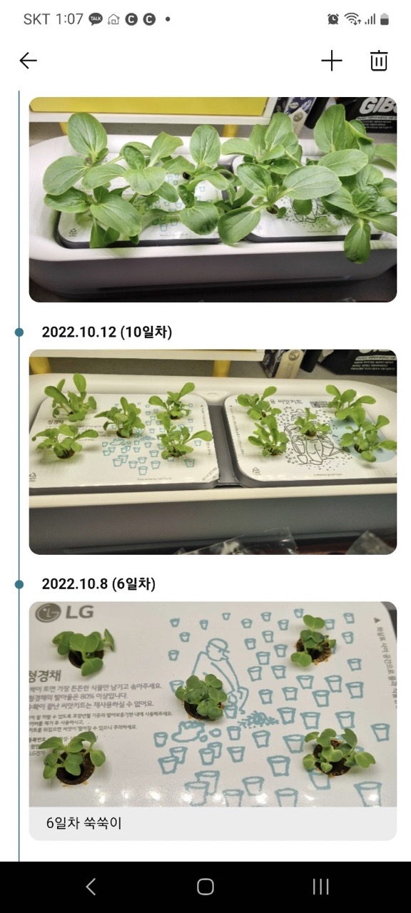 가장 좋은 점은 자라나는 과정을 기록하는 것인데요. 어플로 식물 일기를 쓸 수 있어요. 이런 식으로 간단한 메모와 사진을 남길 수 있으니 식물이 자라는 과정을 즐길 수 있어요. 또한 가끔 아이들 학교에서 숙제로 관찰일기를 쓰기도 하는데 이걸 활용하면 좋은 점이 있어요.