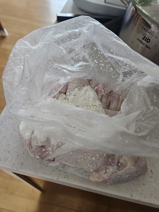 2. 씻은 닭을 봉지에 넣고 튀김가루 2 숟갈, 전분가루 2 숟갈 넣은 후 가루가 잘 묻히도록 섞어줍니다.