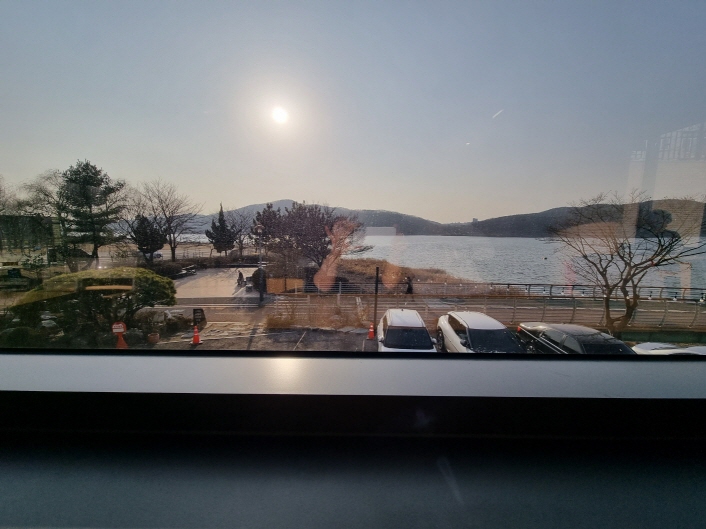 카페 바로 앞에도 주차자리가 있지만 넉넉한 편은 아니라 공영주차장에 주차하시는 게 편해요. (주차하시고 호수데크산책로 쪽으로 걸어오시면 바로 있어요.)