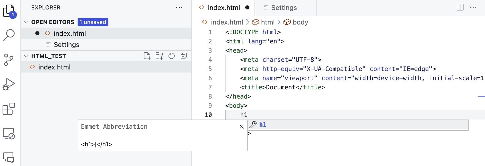 간단히 "Hello, World!"를 입력하고 브라우저에 표시하는 방법을 해보겠습니다. <body> 태그 안에다가 우선 제목을 나타내는 h1을 입력하겠습니다. 이때 마찬가지로 탭을 입력하면 다음과 같이 자동으로 완성됩니다.