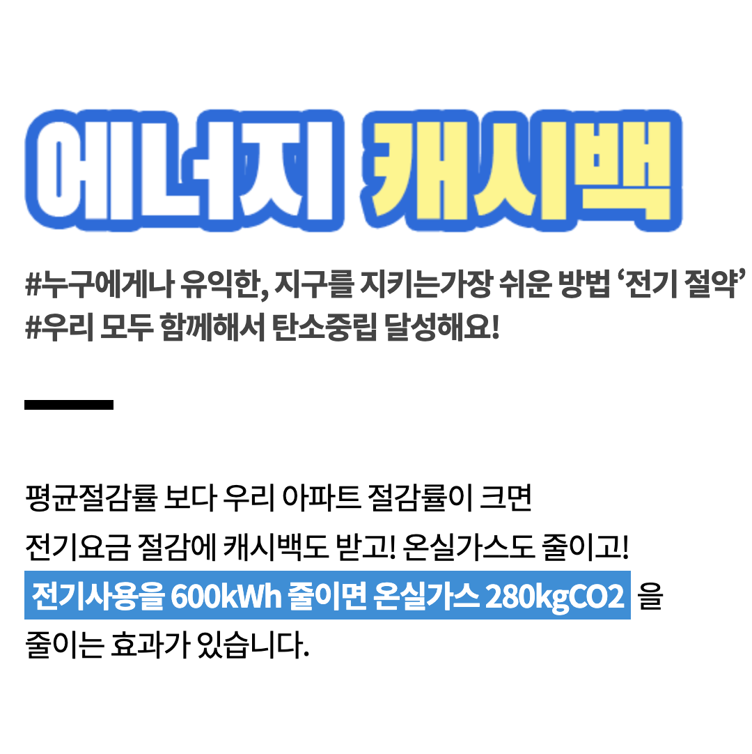 아파트 단지와 개별 세대가 모두 참여할 수 있고, 아파트 및 오피스텔에서도 개별 세대별로 신청이 가능합니다. 전체 참여 아파트 단지 중에서는 전국 평균 절감률보다 높은 절감률(3%)을 달성한 단지에게는 캐시백이 지급됩니다. 개별 세대의 경우에는 전국 평균 절감률과 비교하여 더 적은 전기 사용량을 보인 경우 에너지 캐시백 혜택을 받을 수 있습니다. 하반기에는 혜택이 늘어난다고 하니 자세히 알아보겠습니다.