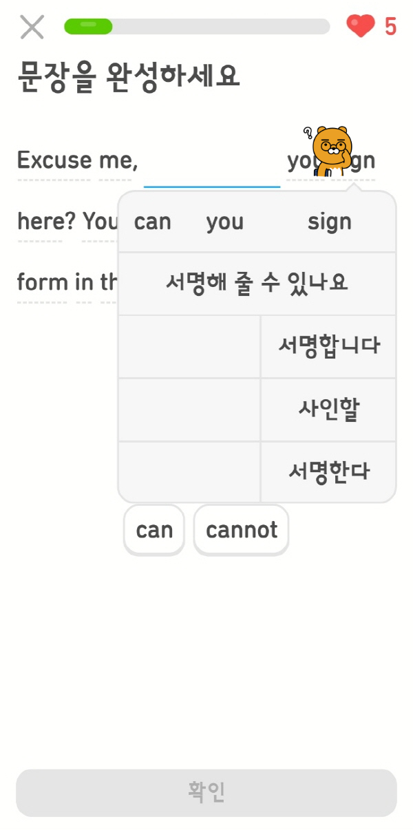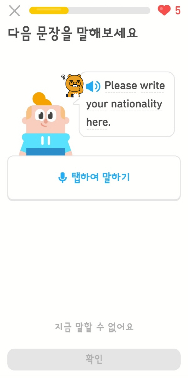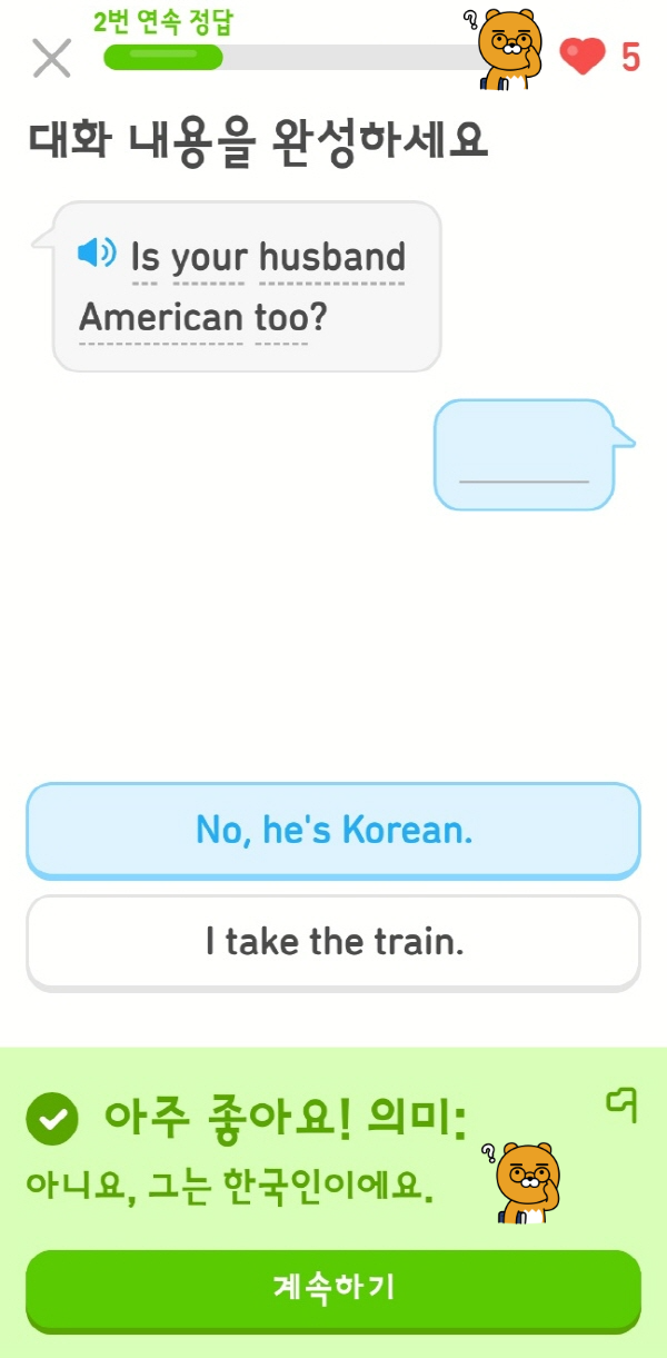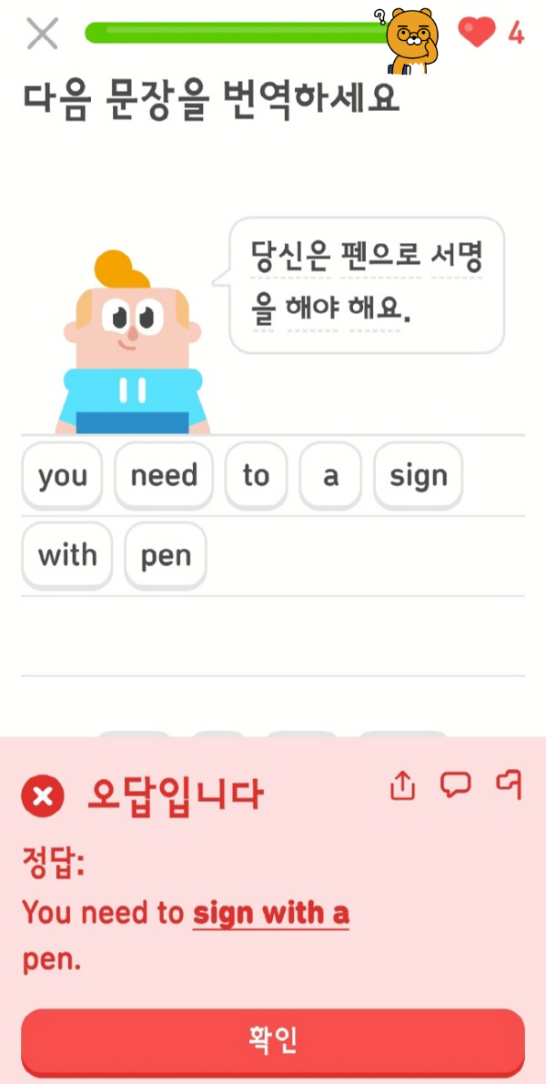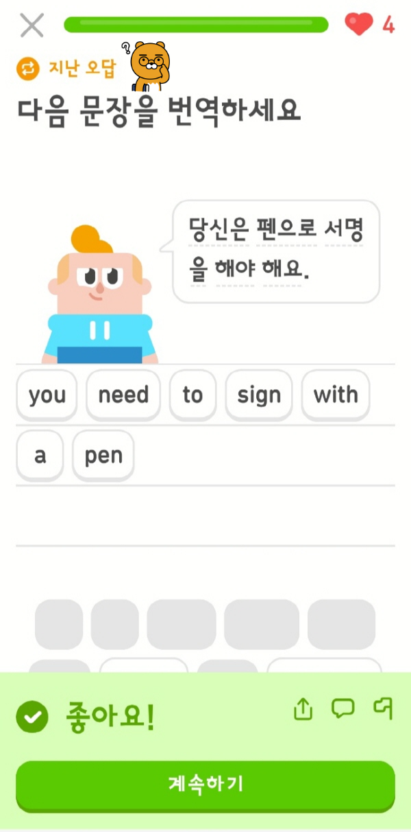 오답을 끝까지 바로잡아주고 반복시키는 게 듀오링고의 장점이지 싶습니다.