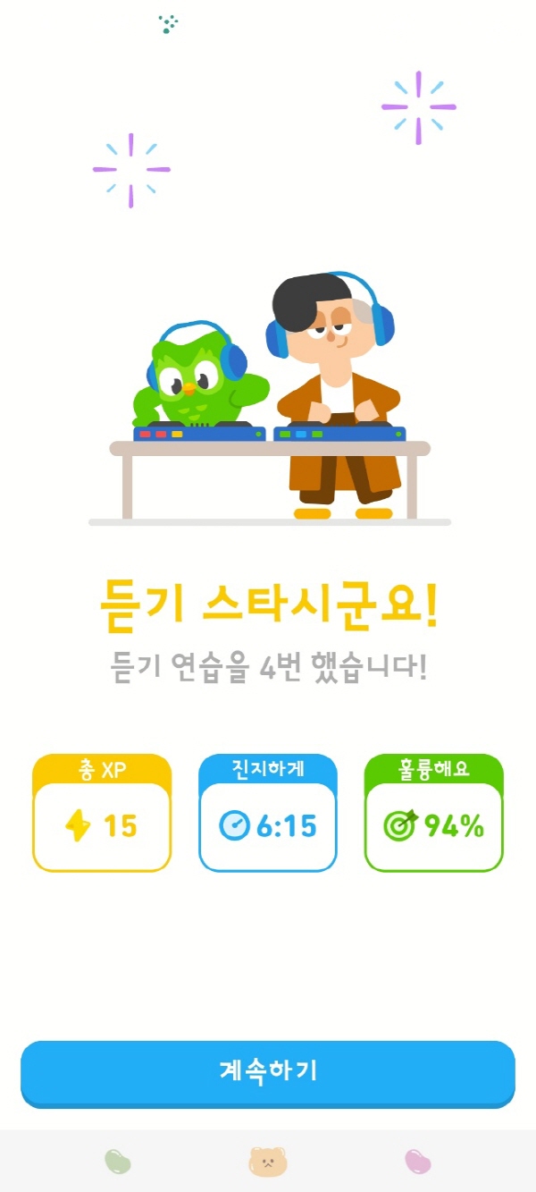 레슨이 끝났네요 끝나면 걸린 시간과 획득한 점수가 나와요 저는 15XP를 획득했어요.