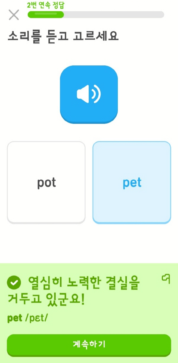 최근에 홈화면의 레슨 말고도 발음을 공부하는 버튼이 하나 더 업데이트되었어요. 레슨 중간에도 발음문제가 한두 개씩 나오기도 하는데 여긴 오로지 발음만 공부해요. 발음이 비슷한 두 단어를 듣고 구분하거나 정확하게 발음하는 것을 학습시켜 줘요.