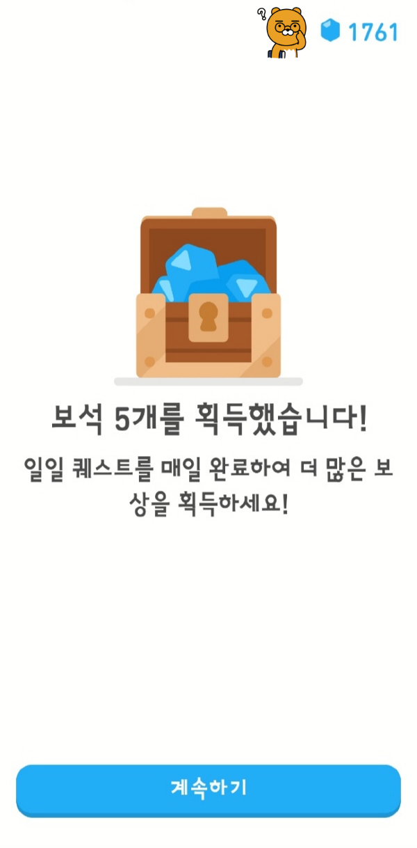 하루 퀘스트를 하나 달성했다고 보석을 받았네요. 보석이 1761개가 됐어요.