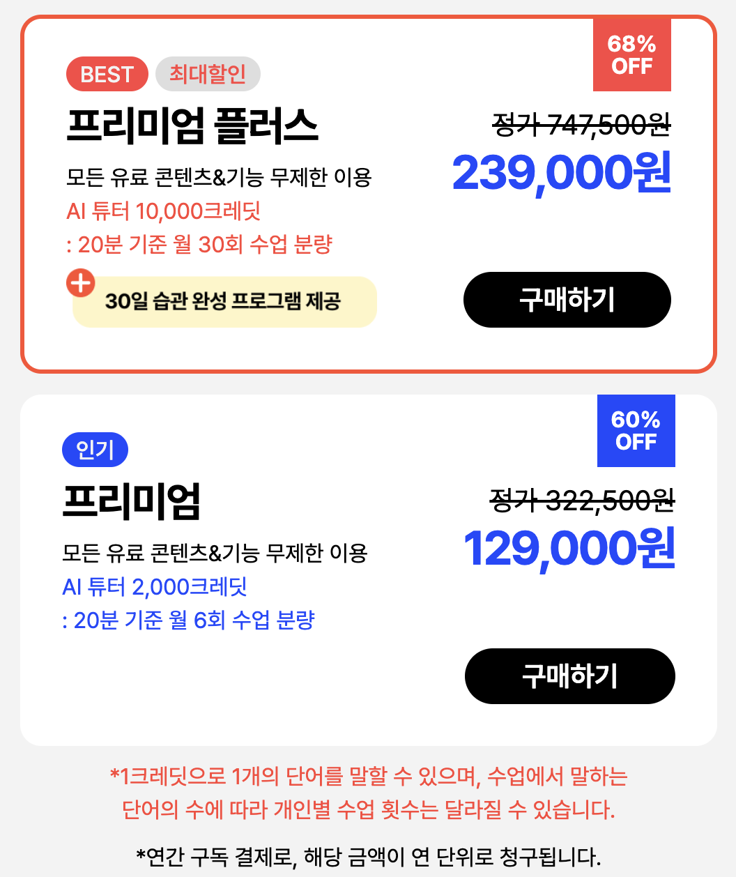 간단히 내가 매일 20분 동안 전화영어 대신 AI랑 얘기할 수 있을까? 고민하시면 어떤 요금제를 할지 정해질 것 같습니다.