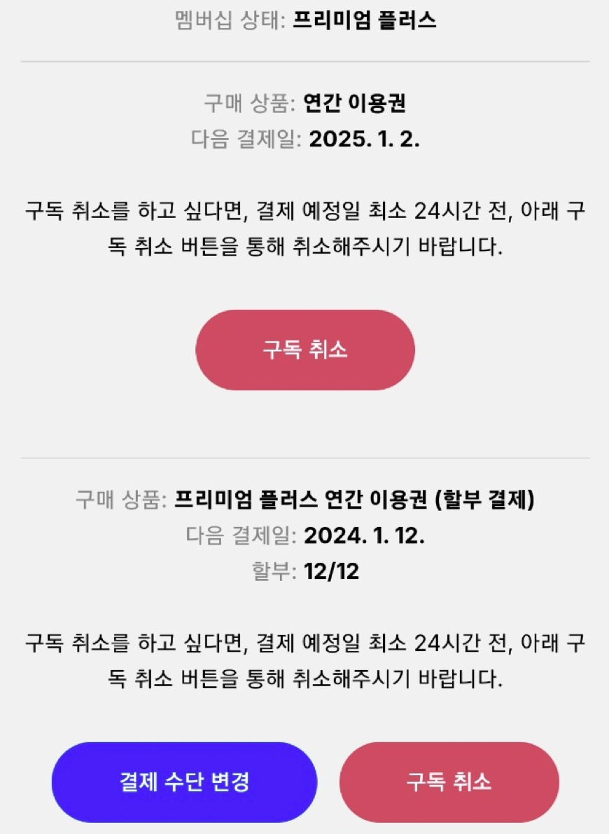 저는 다시 갱신한 것 만큼 후회 없어요. 음 작년에 가입하고, 올해도 가입했는데 10일 차이가 나네요. 이러면 나는 중복가입자가 되는 건가? 프리미엄 플러스인지 프리미엄인지 AI 기능을 써봐야겠어요. 음, 작년에는 제가 할부로 결제를 했었나 보네요.