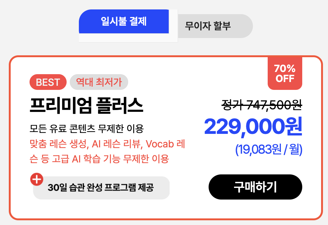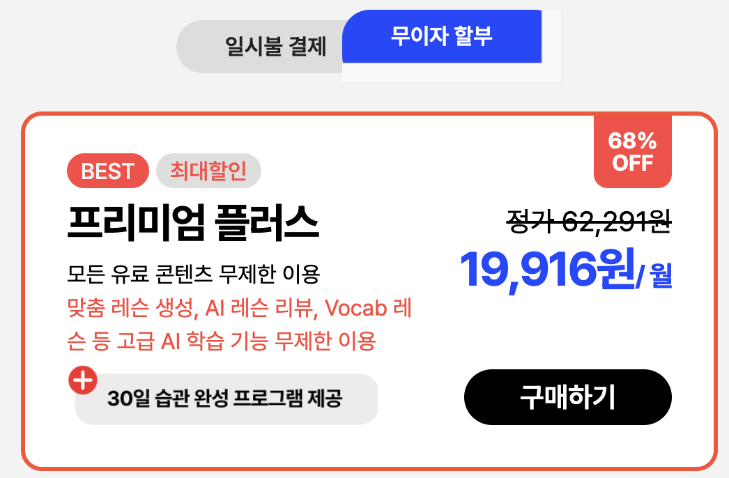 스픽 프리미엄 플러스 무이자 할부는 월 19,916원입니다. 이는 달러로 계산되니 환율에 따라 차이가 있을 수 있어요. 깔끔하게 일시불로 긁어주는것도 좋을 것 같아요. 새해 선물로 영어회화 능력을 선물하세요.