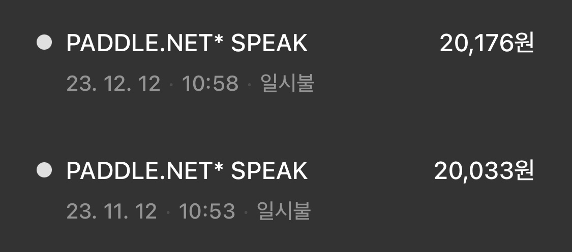 스픽은 크게 두 가지 요금제가 있는데요. 제 최근 결제 기록은 아래와 같습니다. 작년까지는 매달 무이자로 내는걸로 가입했었는데요. 올해는 일시불로 가입해 보려고 합니다. 일시불이 조금 더 싸요. 왜냐하면 매달 내더라도 환율이 변하면 가격이 조금씩 변동되기 때문인데요. 환율이 내릴 것 같다고 생각하시면 무이자 할부를 아니면 일시불을 선택하시는 것도 좋아 보입니다.